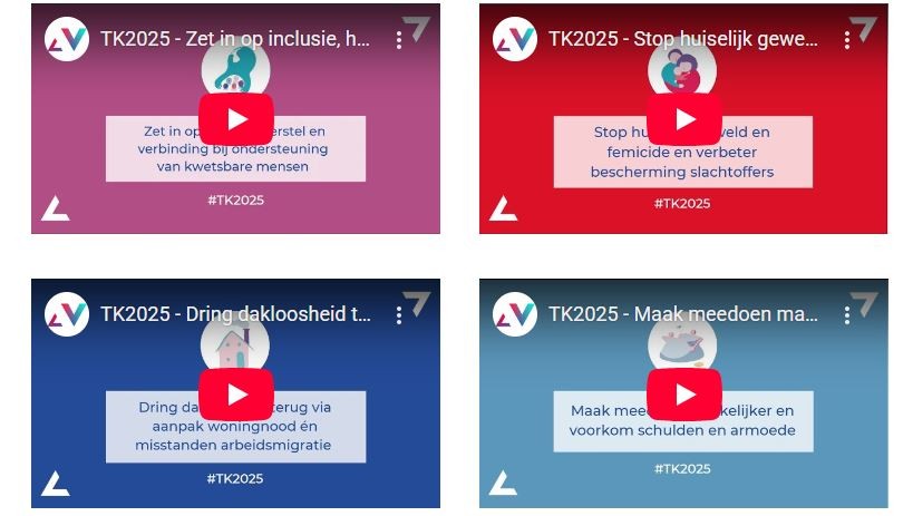 Lees hier alle vox pops | | | | | Video's van onze beleidsadviseurs | | | | Ter ondersteuning van ons verkiezingspamflet maakten we per thema een video waarin we de politiek oproepen om in actie te komen voor kwetsbare mensen in onze samenleving.